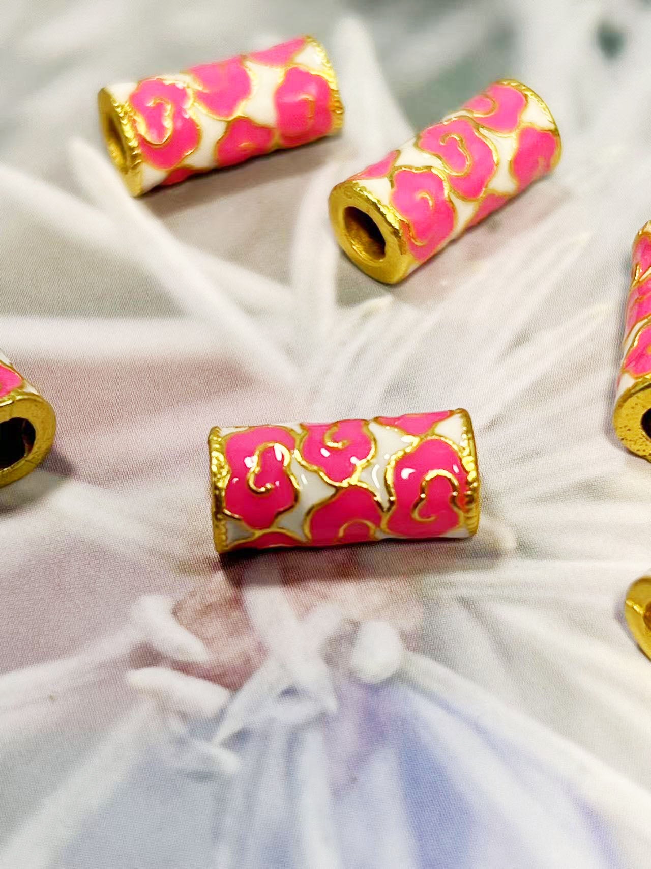 ✨ピンク花柄エナメル筒型ビーズ 7×16mm✨